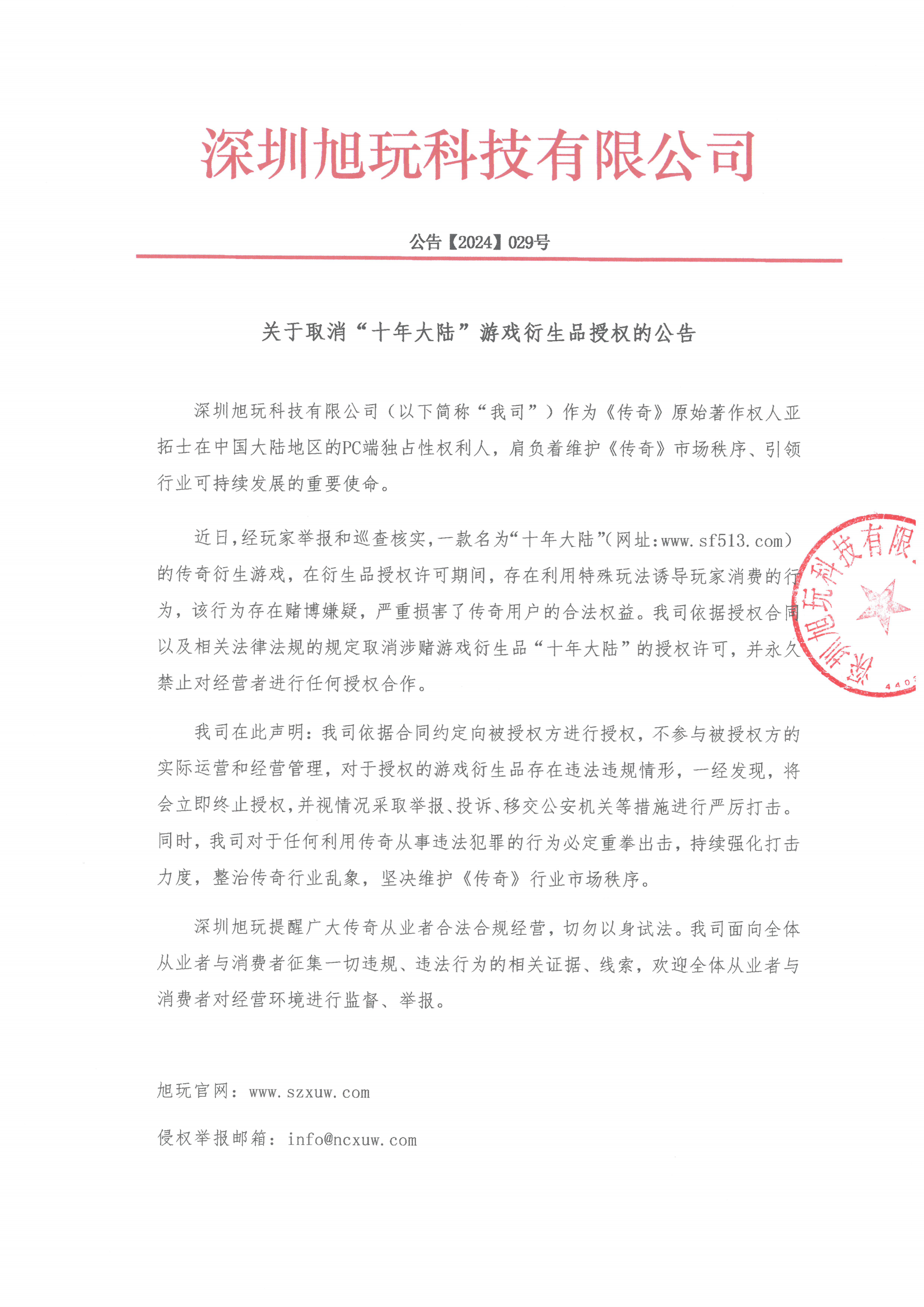 近日,經玩家舉報和巡查核實,一款名為“十年大陸”(網址:www.sf513.com)的傳奇衍生游戲,在衍生品授權許可期間,存在利用特殊玩法誘導玩家消費的行為,該行為存在賭博嫌疑,嚴重損害了傳奇用戶的合法權益。我司依據授權合同以及相關法律法規的規定取消涉賭游戲衍生品“十年大陸”的授權許可,并永久禁止對經營者進行任何授權合作。
