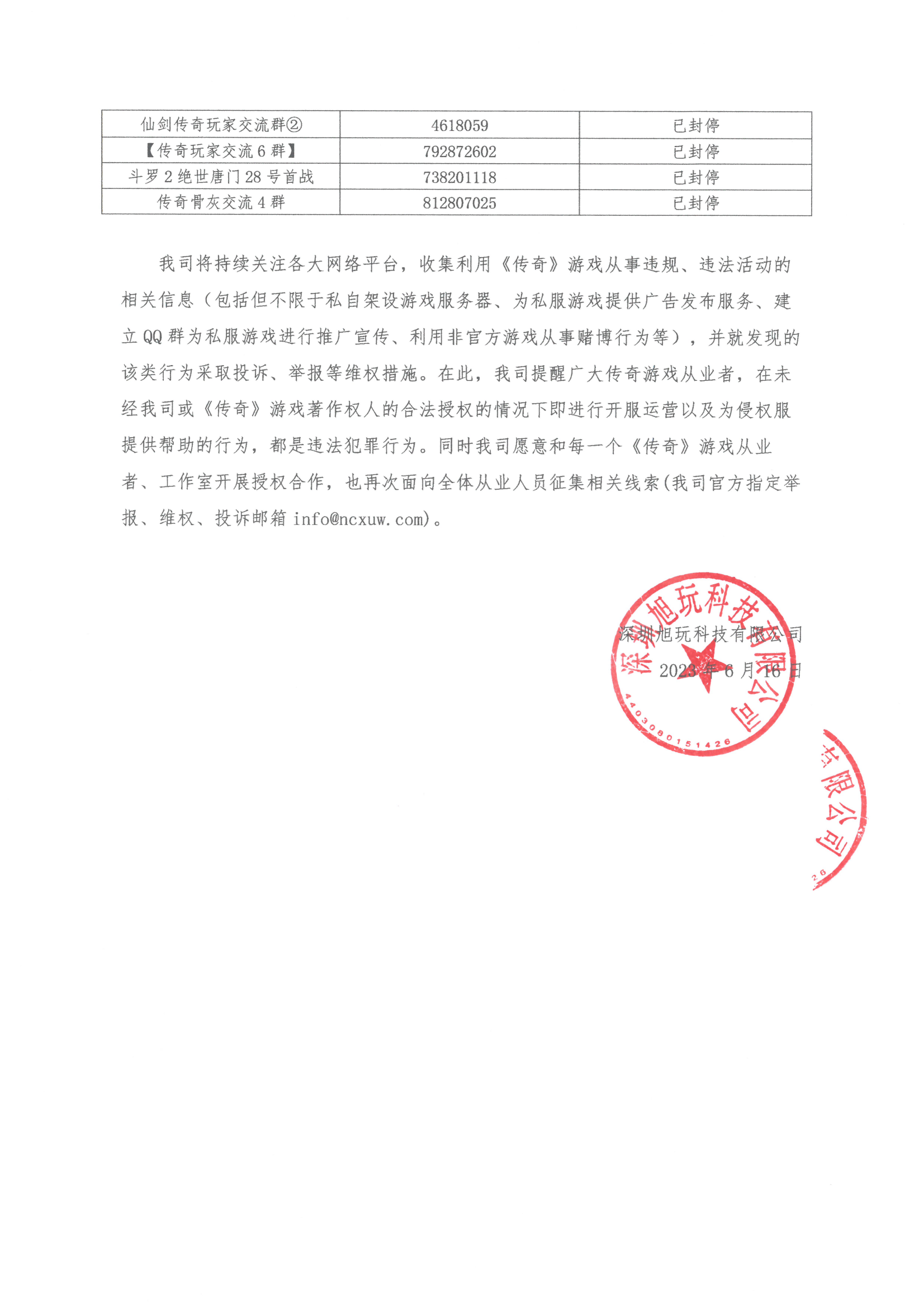 我司將持續關注各大網絡平臺,收集利用《傳奇》游戲從事違規、違法活動的相關信息(包括但不限于未獲授權私自架設游戲服務器、為未獲授權游戲提供廣告發布服務、建立QQ群為未獲授權游戲進行推廣宣傳、利用傳奇游戲從事賭博行為等),并就發現的該類行為采取投訴、舉報、報送公安部門處理等維權措施。在此,我司提醒廣大傳奇游戲從業者,在未經我司或《傳奇》游戲著作權人的合法授權的情況下即進行開服運營以及為侵權服提供幫助的行為,都是違法犯罪行為。同時我司愿意和每一個《傳奇》游戲從業者、工作室開展授權合作,也再次面向全體從業人員征集相關線索(我司官方指定舉報、維權、投訴郵箱info@ncxuw.com)。