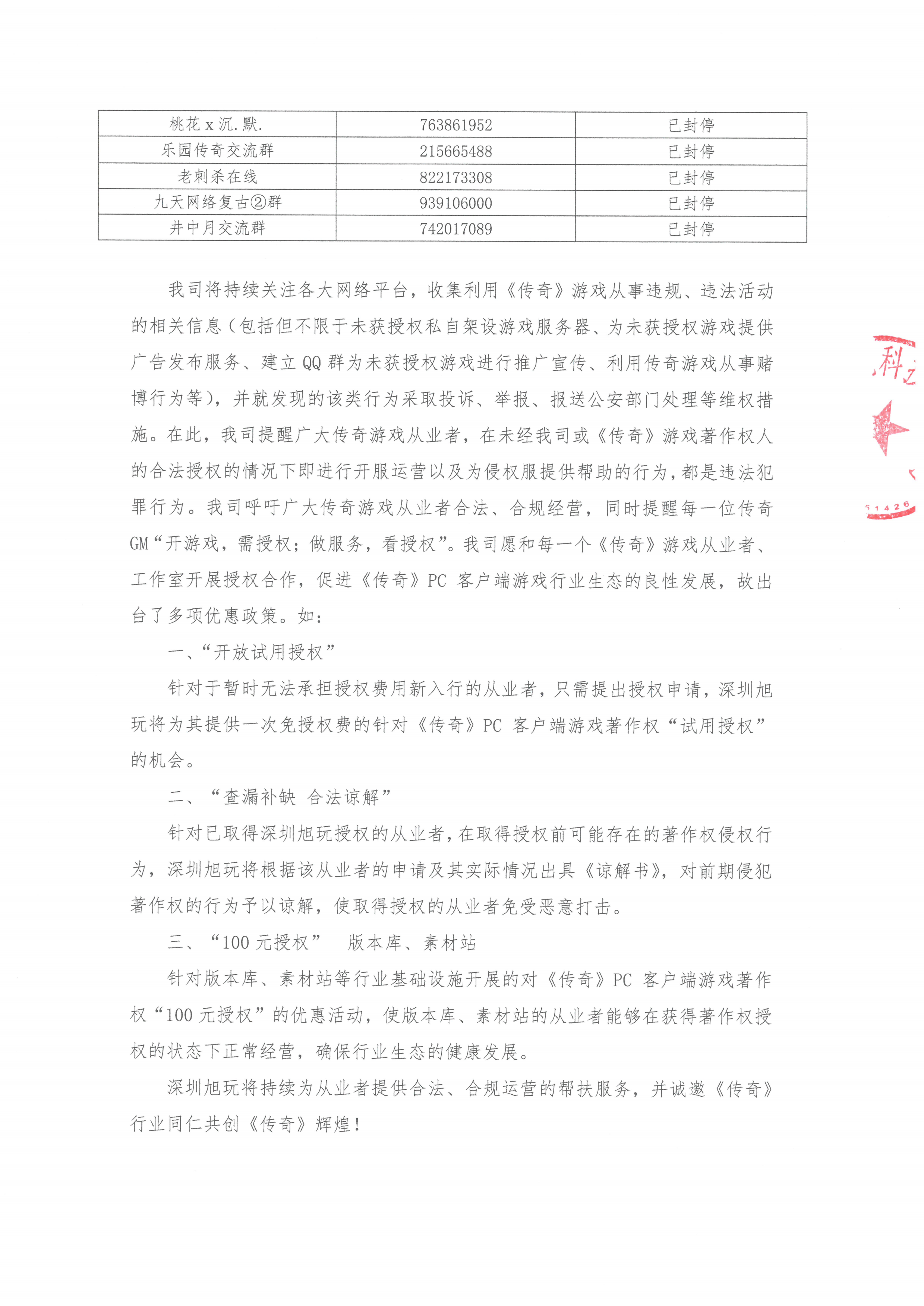 我司將持續關注各大網絡平臺,收集利用《傳奇》游戲從事違規、違法活動的相關信息(包括但不限于未獲授權私自架設游戲服務器、為未獲授權游戲提供廣告發布服務、建立QQ群為未獲授權游戲進行推廣宣傳、利用傳奇游戲從事賭博行為等),并就發現的該類行為采取投訴、舉報、報送公安部門處理等維權措施。在此,我司提醒廣大傳奇游戲從業者,在未經我司或《傳奇》游戲著作權人的合法授權的情況下即進行開服運營以及為侵權服提供幫助的行為,都是違法犯罪行為。我司呼吁廣大傳奇游戲從業者合法、合規經營,同時提醒每一位傳奇GM“開游戲,需授權;做服務,看授權”。我司愿和每一個《傳奇》游戲從業者、工作室開展授權合作,促進《傳奇》PC客戶端游戲行業生態的良性發展,故出臺了多項優惠政策。如: