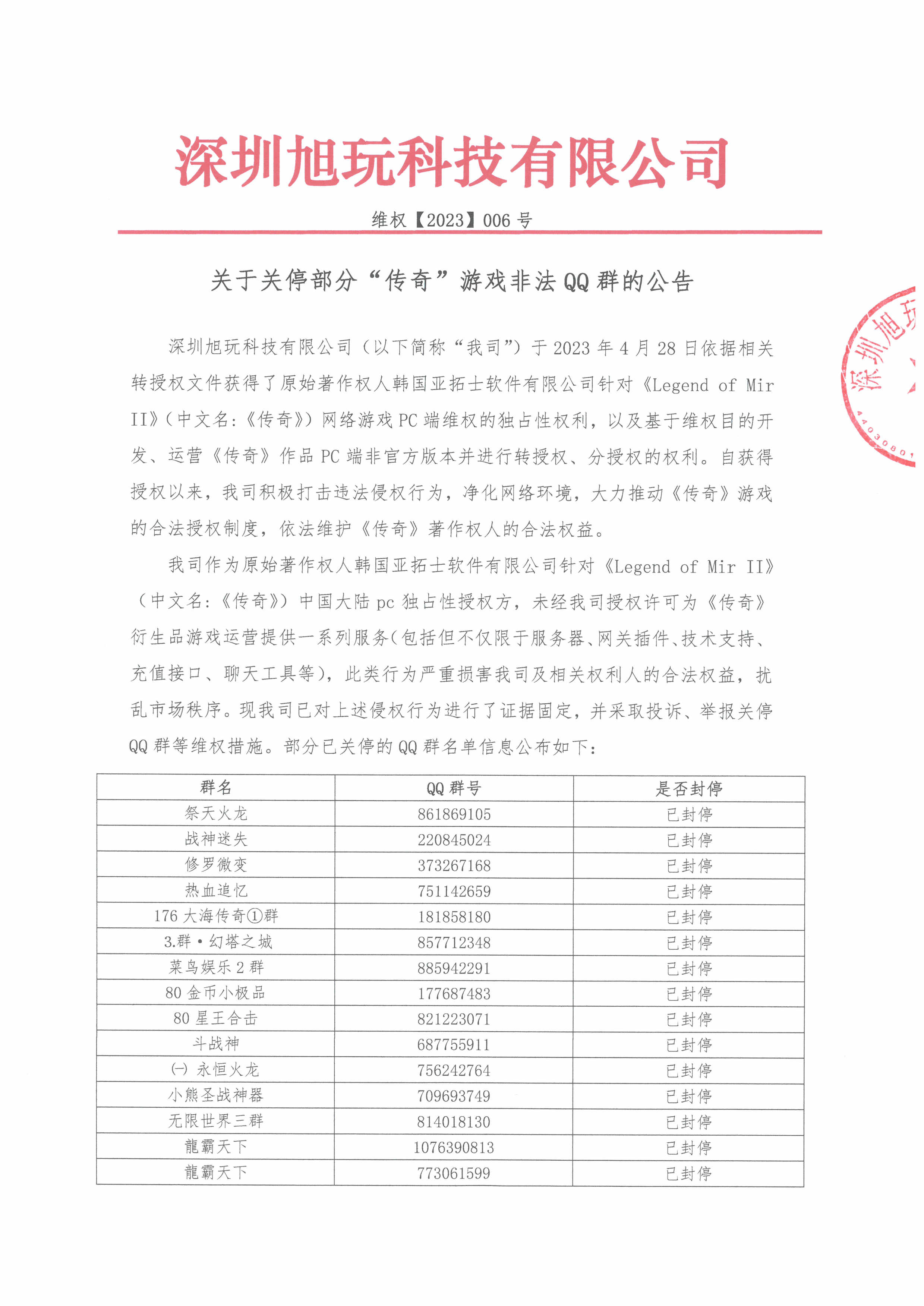 我司作為原始著作權人韓國亞拓士軟件有限公司針對《Legend of Mir II》(中文名:《傳奇》)中國大陸pc獨占性授權方,未經我司授權許可為《傳奇》衍生品游戲運營提供一系列服務(包括但不僅限于服務器、網關插件、技術支持、充值接口、聊天工具等),此類行為嚴重損害我司及相關權利人的合法權益,擾亂市場秩序。現我司已對上述侵權行為進行了證據固定,并采取投訴、舉報關停QQ群等維權措施。部分已關停的QQ群名單信息公布如下:
