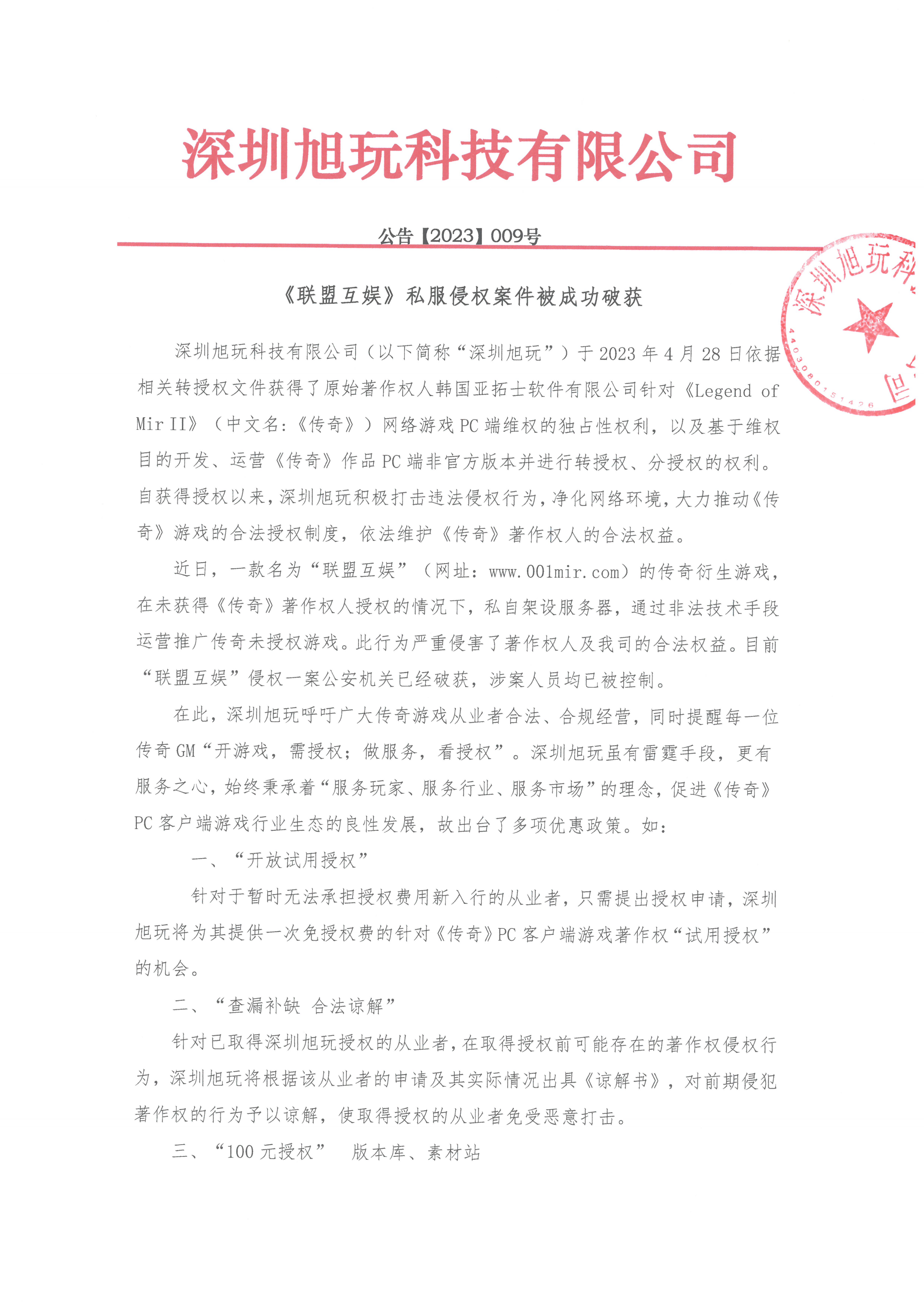 深圳旭玩科技有限公司(以下簡稱“深圳旭玩”)于2023年4月28日依據(jù)相關(guān)轉(zhuǎn)授權(quán)文件獲得了原始著作權(quán)人韓國亞拓士軟件有限公司針對《Legend of Mir II》(中文名:《傳奇》)網(wǎng)絡(luò)游戲PC端維權(quán)的獨占性權(quán)利,以及基于維權(quán)目的開發(fā)、運營《傳奇》作品PC端非官方版本并進行轉(zhuǎn)授權(quán)、分授權(quán)的權(quán)利。自獲得授權(quán)以來,深圳旭玩積極打擊違法侵權(quán)行為,凈化網(wǎng)絡(luò)環(huán)境,大力推動《傳奇》游戲的合法授權(quán)制度,依法維護《傳奇》著作權(quán)人的合法權(quán)益。