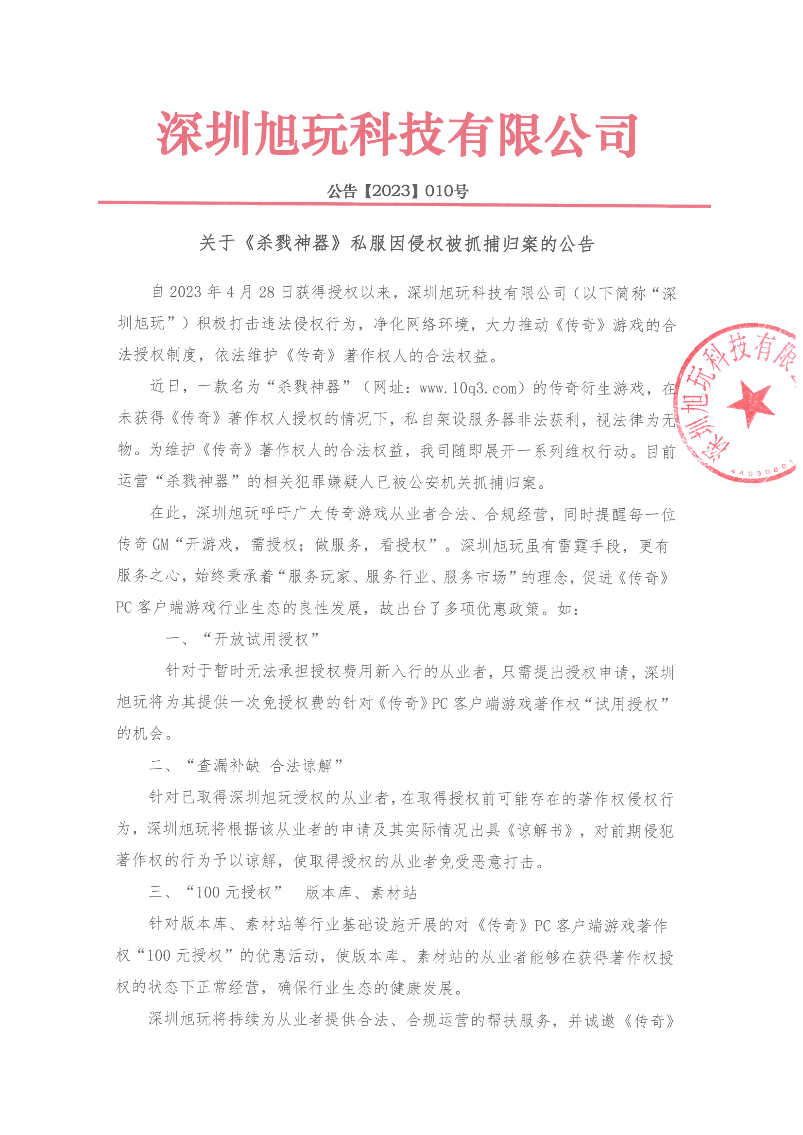 自2023年4月28日獲得授權以來,深圳旭玩科技有限公司(以下簡稱“深圳旭玩”)積極打擊違法侵權行為,凈化網絡環境,大力推動《傳奇》游戲的合法授權制度,依法維護《傳奇》著作權人的合法權益。