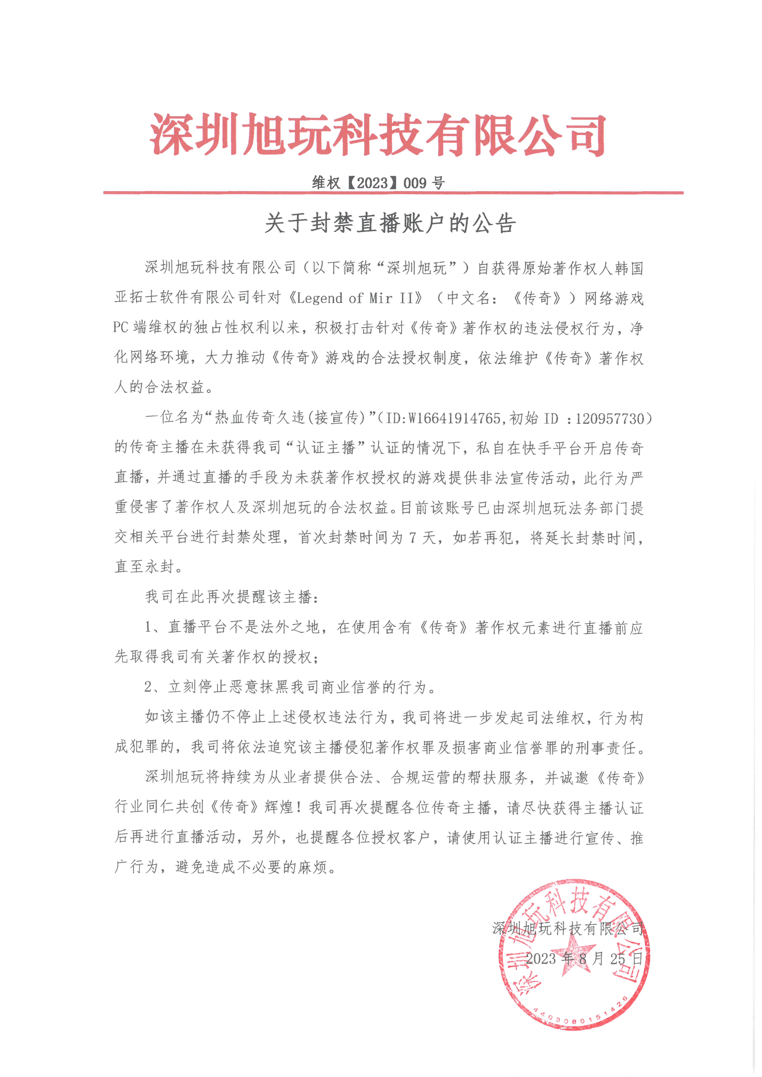 一位名為“熱血傳奇久違(接宣傳)”(ID:W16641914765,初始ID :120957730)的傳奇主播在未獲得我司“認(rèn)證主播”認(rèn)證的情況下,私自在快手平臺(tái)開(kāi)啟傳奇直播,并通過(guò)直播的手段為未獲著作權(quán)授權(quán)的游戲提供非法宣傳活動(dòng),此行為嚴(yán)重侵害了著作權(quán)人及深圳旭玩的合法權(quán)益。目前該賬號(hào)已由深圳旭玩法務(wù)部門提交相關(guān)平臺(tái)進(jìn)行封禁處理,首次封禁時(shí)間為7天,如若再犯,將延長(zhǎng)封禁時(shí)間,直至永封。