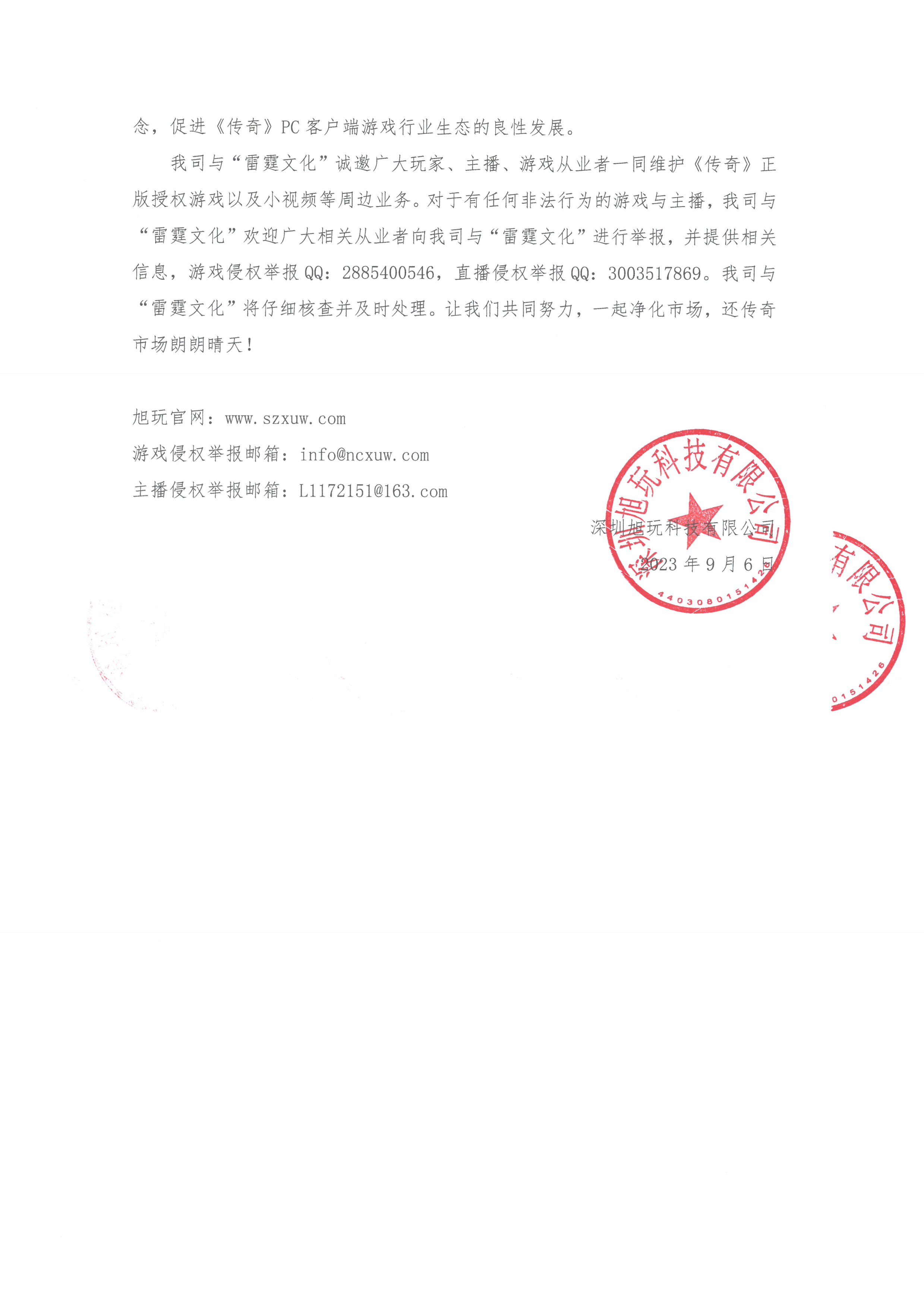 在此,我司呼吁廣大傳奇游戲從業者合法、合規經營,同時提醒每一位傳奇游戲從業者和主播從業者“開游戲,需授權;做服務,看授權”。深圳旭玩雖有雷霆手段,更有服務之心,始終秉承著“服務玩家、服務行業、服務市場”的理念,促進《傳奇》PC客戶端游戲行業生態的良性發展。