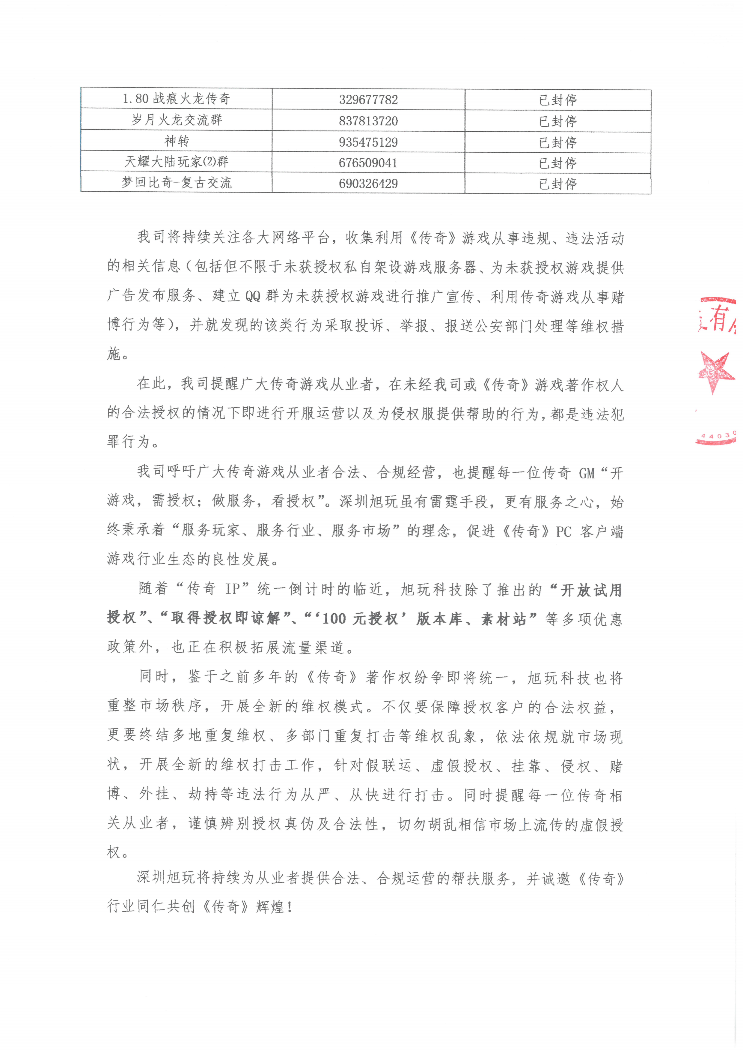 我司將持續(xù)關(guān)注各大網(wǎng)絡(luò)平臺(tái),收集利用《傳奇》游戲從事違規(guī)、違法活動(dòng)的相關(guān)信息(包括但不限于未獲授權(quán)私自架設(shè)游戲服務(wù)器、為未獲授權(quán)游戲提供廣告發(fā)布服務(wù)、建立QQ群為未獲授權(quán)游戲進(jìn)行推廣宣傳、利用傳奇游戲從事賭博行為等),并就發(fā)現(xiàn)的該類行為采取投訴、舉報(bào)、報(bào)送公安部門處理等維權(quán)措施。