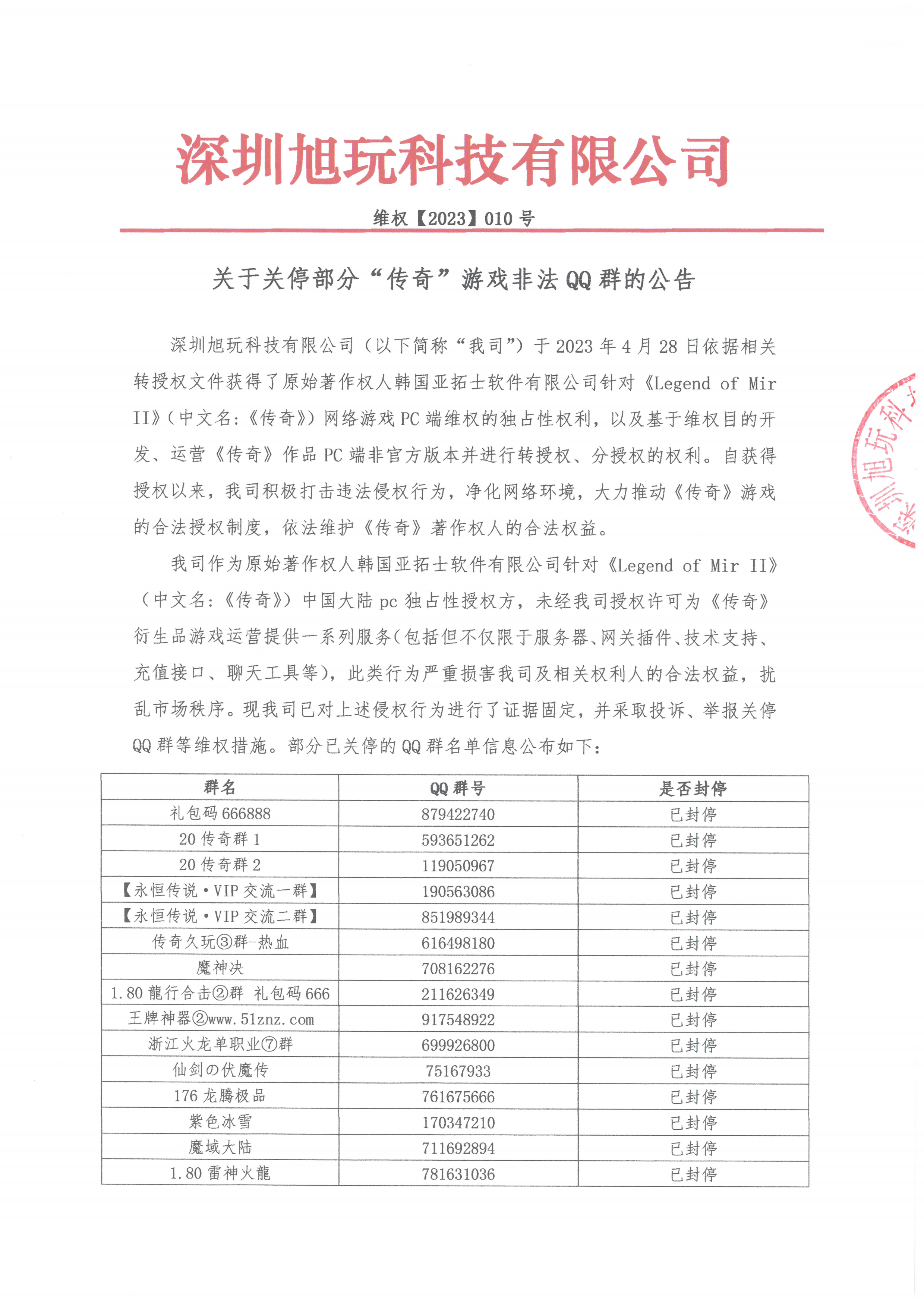 我司作為原始著作權(quán)人韓國亞拓士軟件有限公司針對(duì)《Legend of Mir II》(中文名:《傳奇》)中國大陸pc獨(dú)占性授權(quán)方,未經(jīng)我司授權(quán)許可為《傳奇》衍生品游戲運(yùn)營提供一系列服務(wù)(包括但不僅限于服務(wù)器、網(wǎng)關(guān)插件、技術(shù)支持、充值接口、聊天工具等),此類行為嚴(yán)重?fù)p害我司及相關(guān)權(quán)利人的合法權(quán)益,擾亂市場(chǎng)秩序。現(xiàn)我司已對(duì)上述侵權(quán)行為進(jìn)行了證據(jù)固定,并采取投訴、舉報(bào)關(guān)停QQ群等維權(quán)措施。部分已關(guān)停的QQ群名單信息公布如下:
