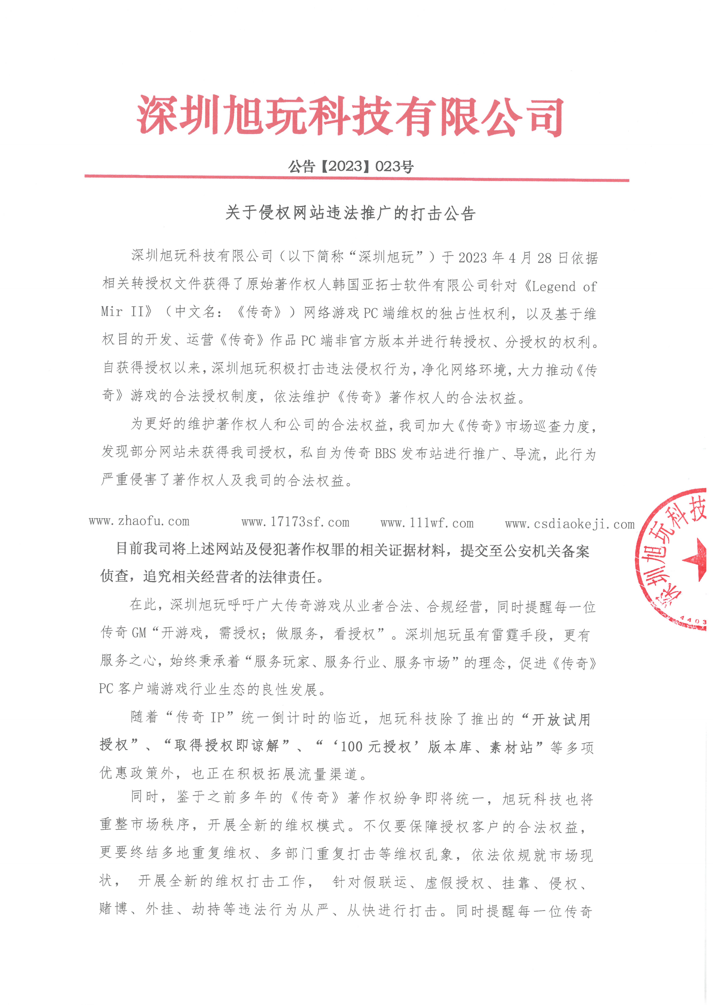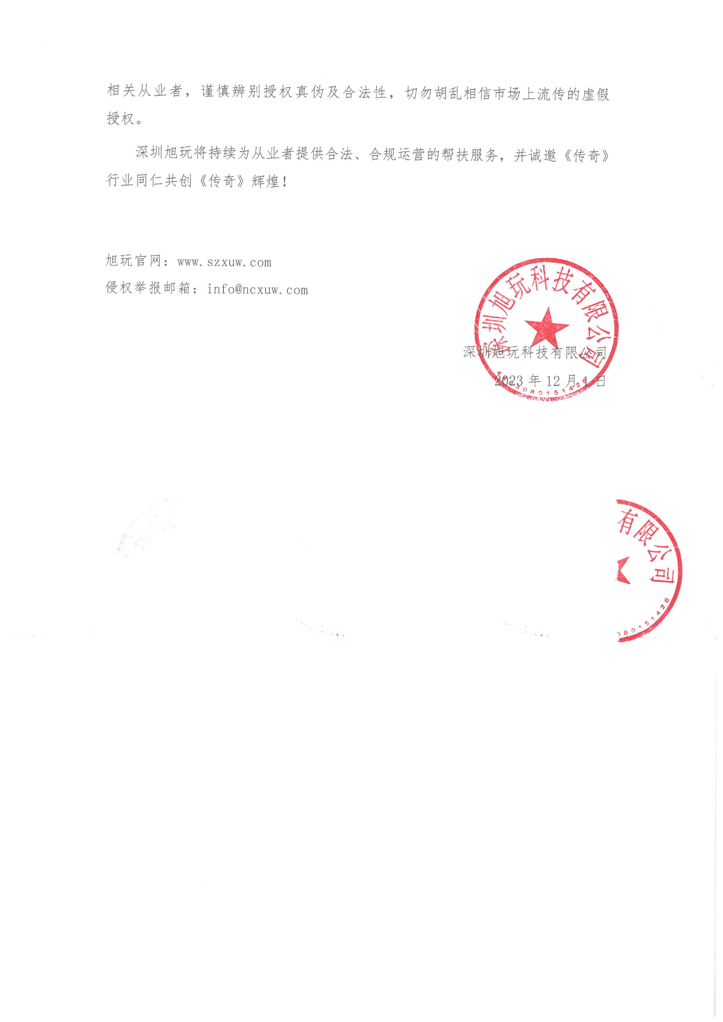 深圳旭玩科技有限公司(以下簡稱“深圳旭玩”)于2023年4月28日依據相關轉授權文件獲得了原始著作權人韓國亞拓士軟件有限公司針對《Legend of Mir II》(中文名:《傳奇》)網絡游戲PC端維權的獨占性權利,以及基于維權目的開發、運營《傳奇》作品PC端非官方版本并進行轉授權、分授權的權利。自獲得授權以來,深圳旭玩積極打擊違法侵權行為,凈化網絡環境,大力推動《傳奇》游戲的合法授權制度,依法維護《傳奇》著作權人的合法權益。