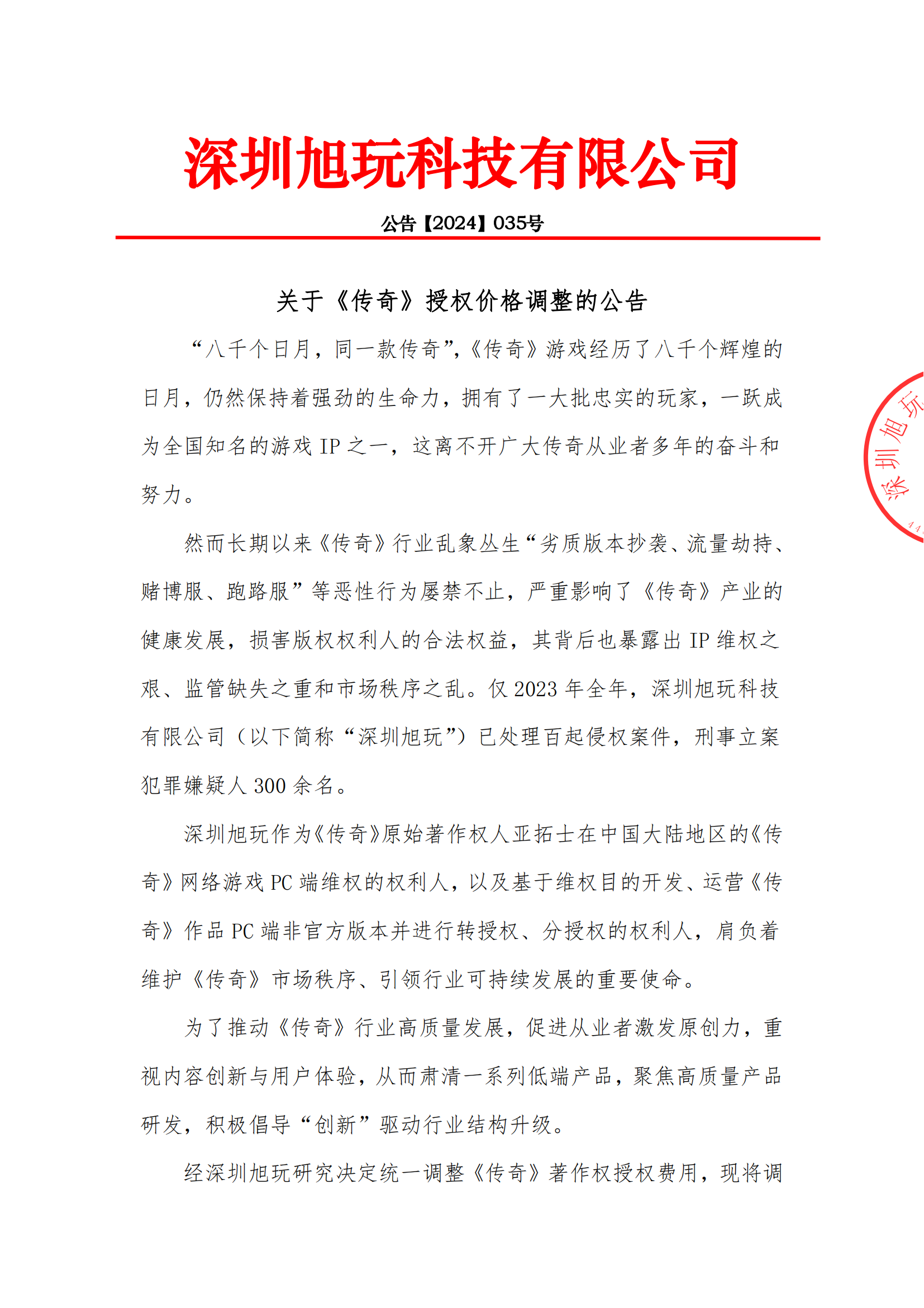 經(jīng)深圳旭玩研究決定統(tǒng)一調(diào)整《傳奇》著作權(quán)授權(quán)費(fèi)用,現(xiàn)將調(diào)整方案公布如下并于2024年05月01日正式執(zhí)行(原“星級(jí)”標(biāo)準(zhǔn)自2024年05月01日起廢止。):