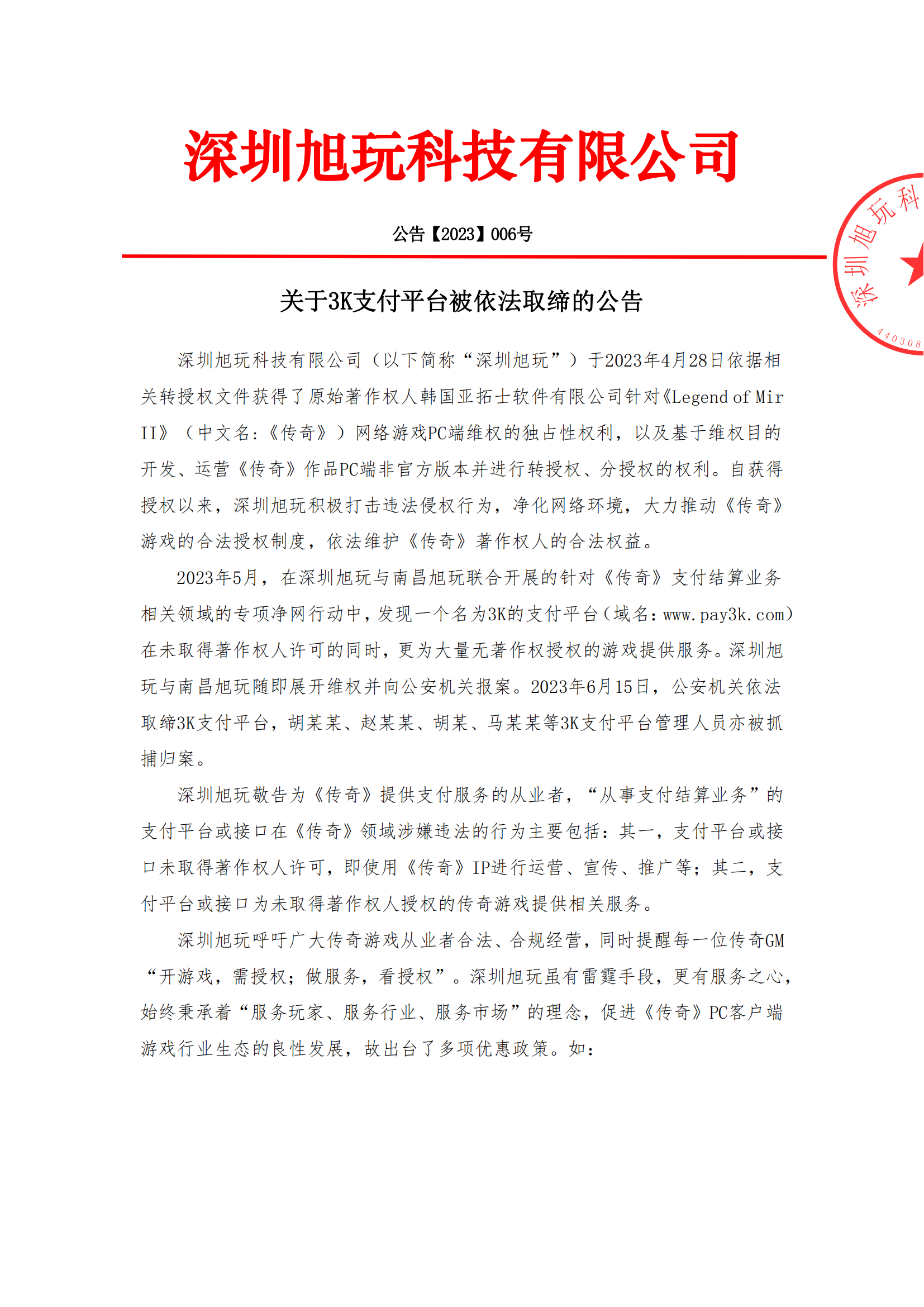 深圳旭玩敬告為《傳奇》提供支付服務的從業者,“從事支付結算業務”的支付平臺或接口在《傳奇》領域涉嫌違法的行為主要包括:其一,支付平臺或接口未取得著作權人許可,即使用《傳奇》IP進行運營、宣傳、推廣等;其二,支付平臺或接口為未取得著作權人授權的傳奇游戲提供相關服務。 深圳旭玩呼吁廣大傳奇游戲從業者合法、合規經營,同時提醒每一位傳奇GM“開游戲,需授權;做服務,看授權”。深圳旭玩雖有雷霆手段,更有服務之心,始終秉承著“服務玩家、服務行業、服務市場”的理念,促進《傳奇》PC客戶端游戲行業生態的良性發展,故出臺了多項優惠政策。如: